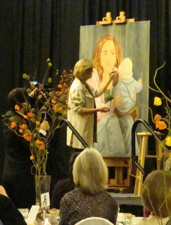 The left photo shows Jennifer in the process of ‘creating a visual memory’ at the gala dinner while a narrator spoke about the center, their clients and their needs, with a pianist playing softly in the background.